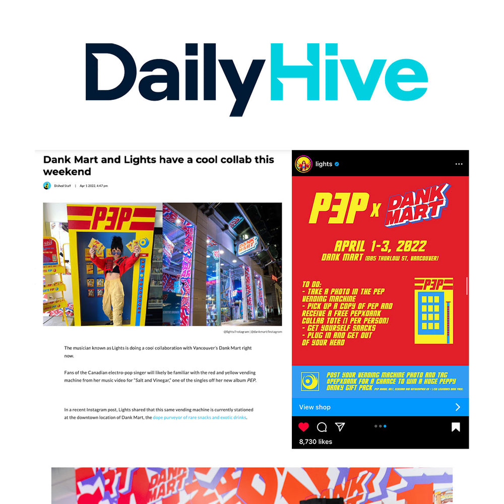 Treasured Canadian artist Lights partnered with us at our Dank Mart Robson location for her Album Release of Pep! Dank Mart hosted Lights and her team for three days at our Robson Street location. The Collaboration featured a lifesize, hand crafted PEP Vending Machine designed for fans to interact with and take a picture inside the vending machine for their chance to win an ultimate album release giveaway including branded Lights Merch, copies of PEP and a Legendary Dank Pack with over $150 worth of rare and exotic snacks.